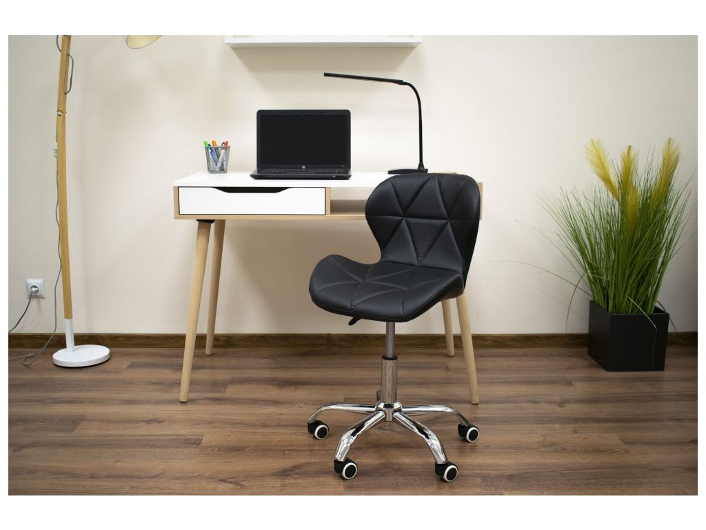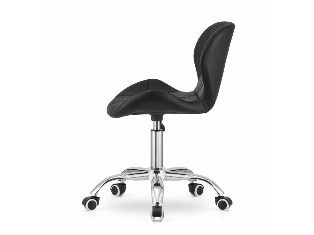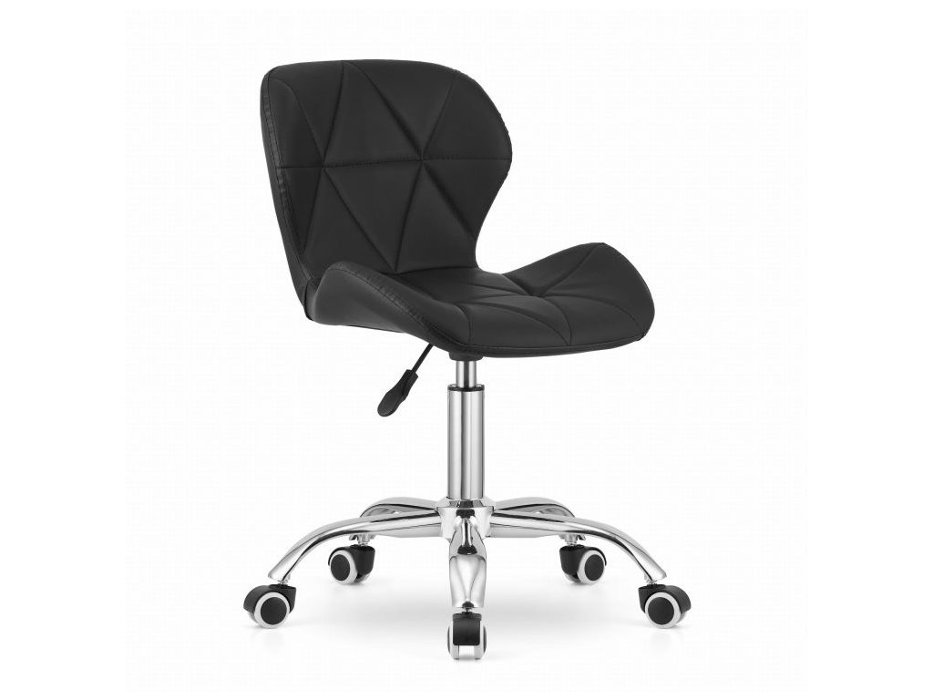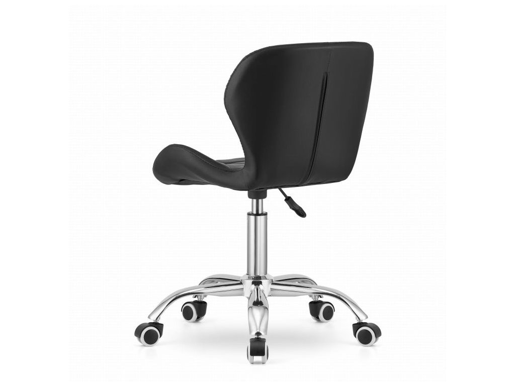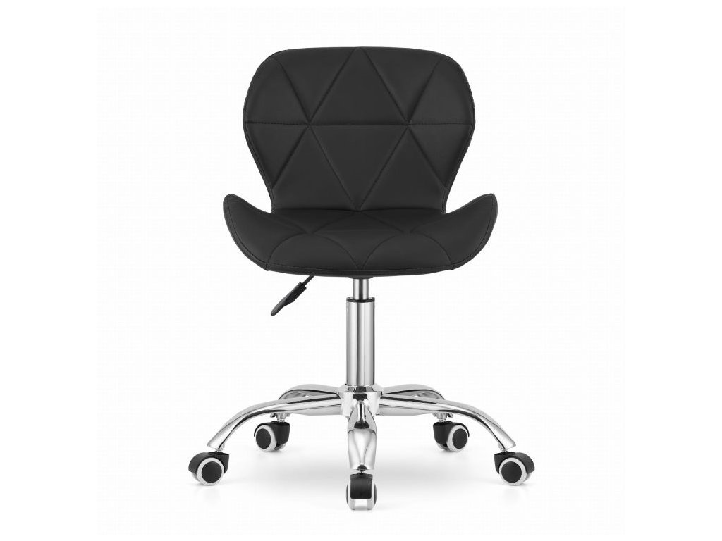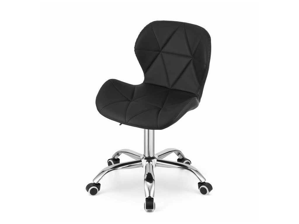 Spodní část tvoří chromovaná pětiramenná základna na pogumovaných kolečkách, která zajišťuje stabilitu a ochranu podlahy. Sedák je potažen prošívanou ekokůží, která kombinuje elegantní vzhled s jednoduchou údržbou.